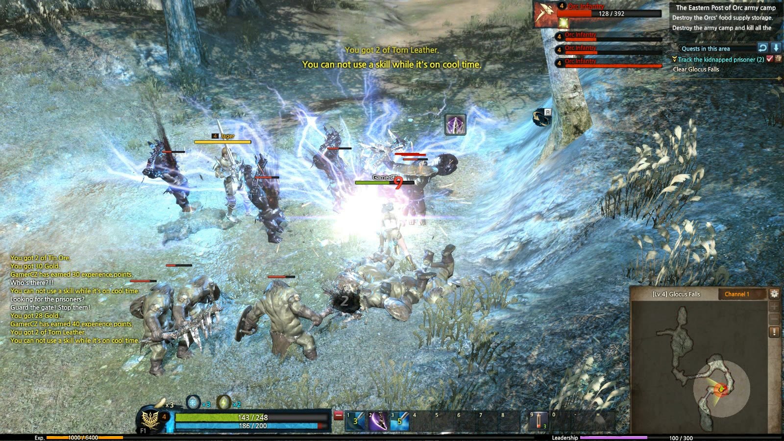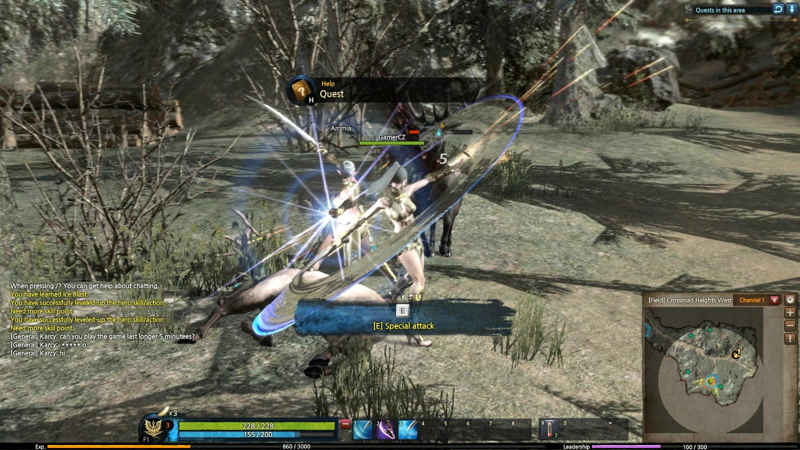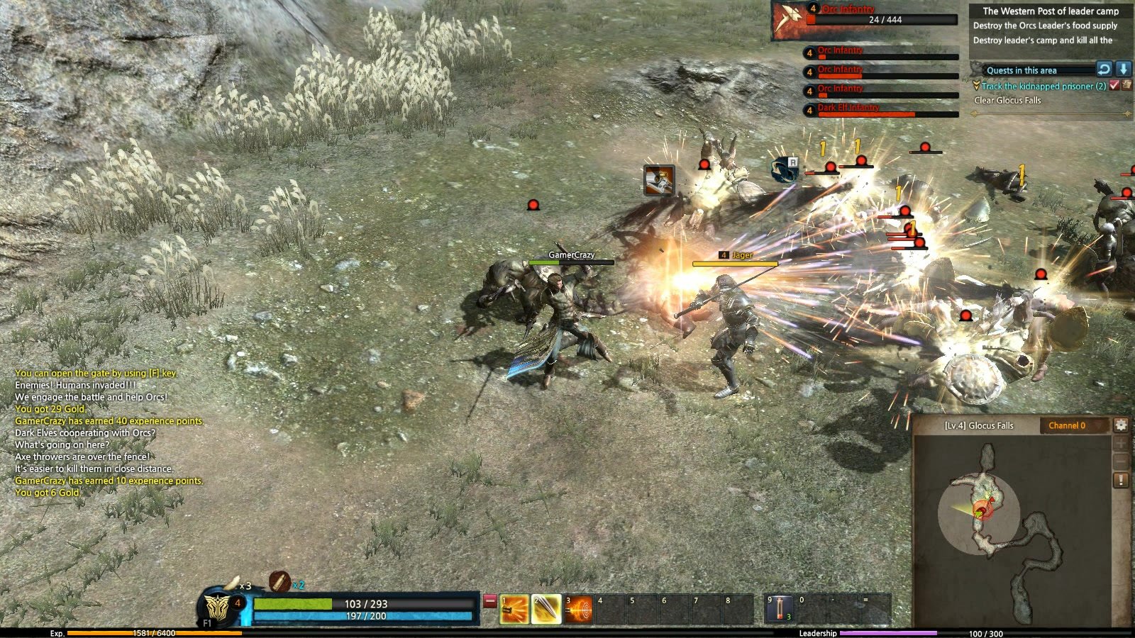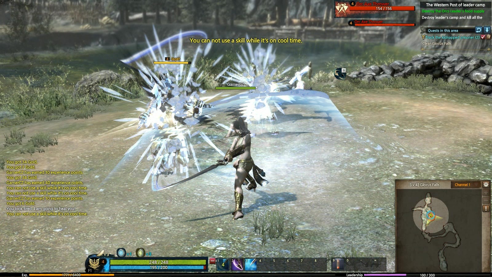 當敵人倒地或是震暈的時候,按下 E 鍵就可以發動倒地攻擊或是追擊,追擊的攻擊方式會依職業而有所不同,像「Gunslinger」就是連續快速開槍射擊,而「Spellsword」則是凍結敵人;R 鍵可以施展英雄的特殊技能。以「Spellsword」為例就是依照目前累積的符文種類和數量,施展出各種不同效果的法術或攻擊。