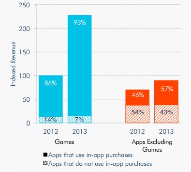 藍色實心區塊代表使用內購機制的 App 營業額,虛線部分則代表不使用內購機制的 App 營業額;橘色區塊為遊戲分類以外的 App 統計數據(統計圖表引用自 App Annie)