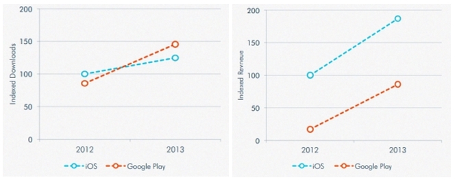 【iOS 與 Google Play 的下載量(左)與營收(右)比較圖】