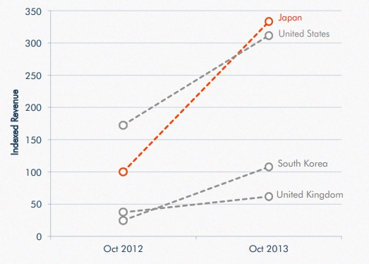 日本在 2013 年正式超越美國,成為全球最大的 App 市場(統計圖表引用自 App Annie)