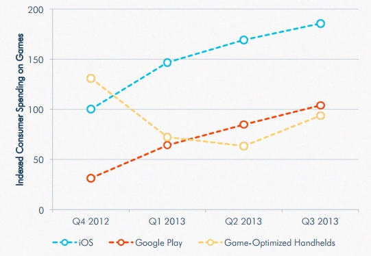 根據 App Annie 自 2012 年第四季至 2013 年第三季的分析報告中,可以觀察到掌機在 2012 年底依然處於高峰,但自此之後一路往下衰退,直到 2013 年第二季才又開始慢慢成長。
