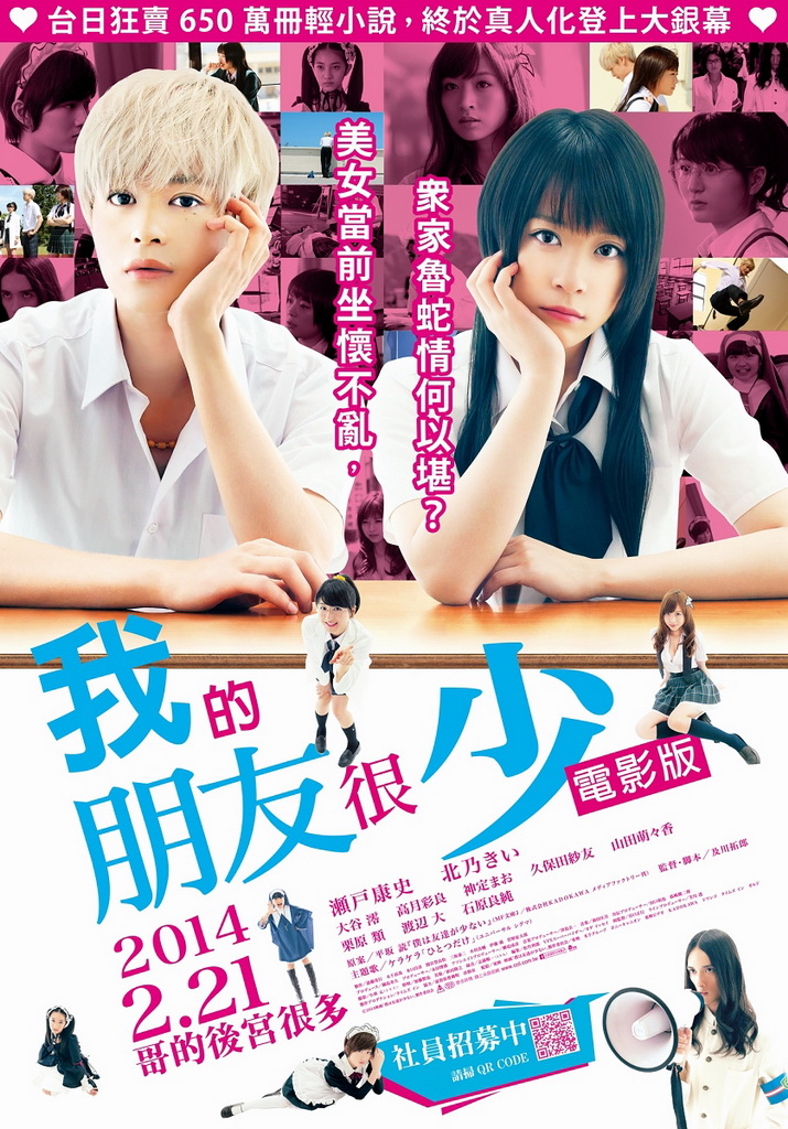 我的朋友很少電影版》劇情描述羽瀨川小鷹(瀨戶康史飾演)天生有著兇惡眼神和一頭金髮,讓他總被誤會成是不良少年,因而無法順利交到朋友。某天放學,他在教室裡看到對空氣自言自語的黑髮美少女三日月夜空(北乃紀伊飾演),讓他就這樣被夜空拉入莫名成立的「鄰人社」。這個以「能順利交到朋友」為宗旨的社團,隨著巨乳千金柏崎星奈(大谷澪飾演)等問題美少女的加入,也就這樣展開了熱鬧不已的校園社團生活。