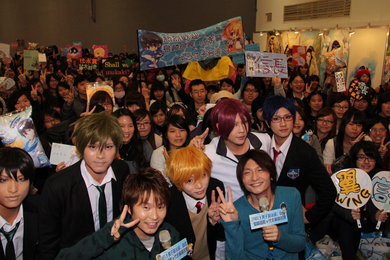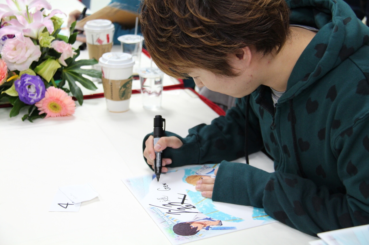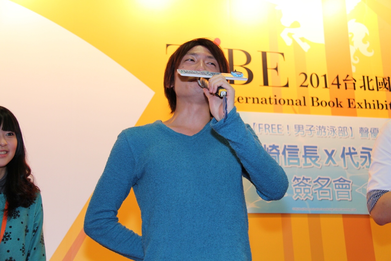 這次兩人的簽名會原定在中午 12 點半舉行,但由於日本當地氣候惡劣,飛機無法起飛,直至今天上午雪勢和緩飛機可正常起降,兩人才有機會抵達台灣參與活動與粉絲見面。在活動開始前主持人不斷與台下互動,粉絲也熱情提供多個《FREE!》及聲優個人的小飾品讓主辦單位裝飾麥克風,讓平常舉行活動時擔任輔助角色的麥克風添加幾分風采。