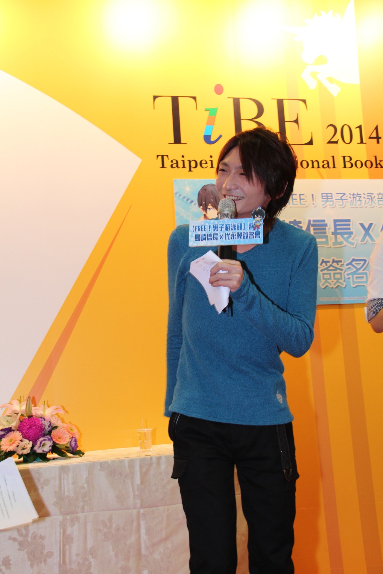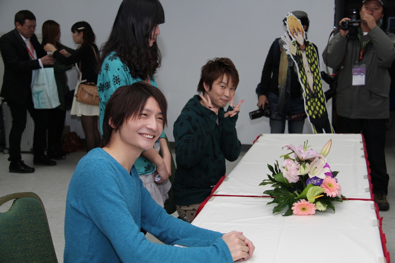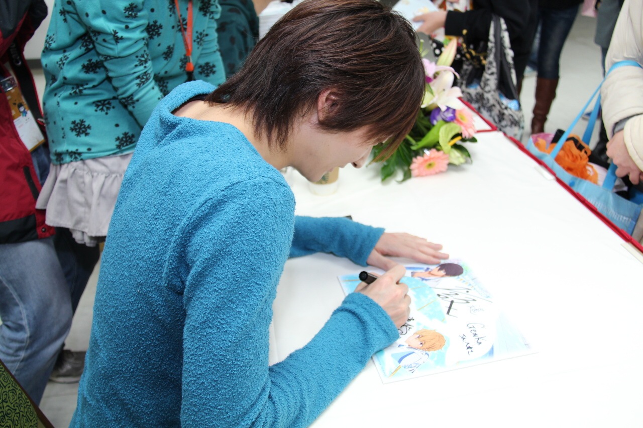這次兩人的簽名會原定在中午 12 點半舉行,但由於日本當地氣候惡劣,飛機無法起飛,直至今天上午雪勢和緩飛機可正常起降,兩人才有機會抵達台灣參與活動與粉絲見面。在活動開始前主持人不斷與台下互動,粉絲也熱情提供多個《FREE!》及聲優個人的小飾品讓主辦單位裝飾麥克風,讓平常舉行活動時擔任輔助角色的麥克風添加幾分風采。