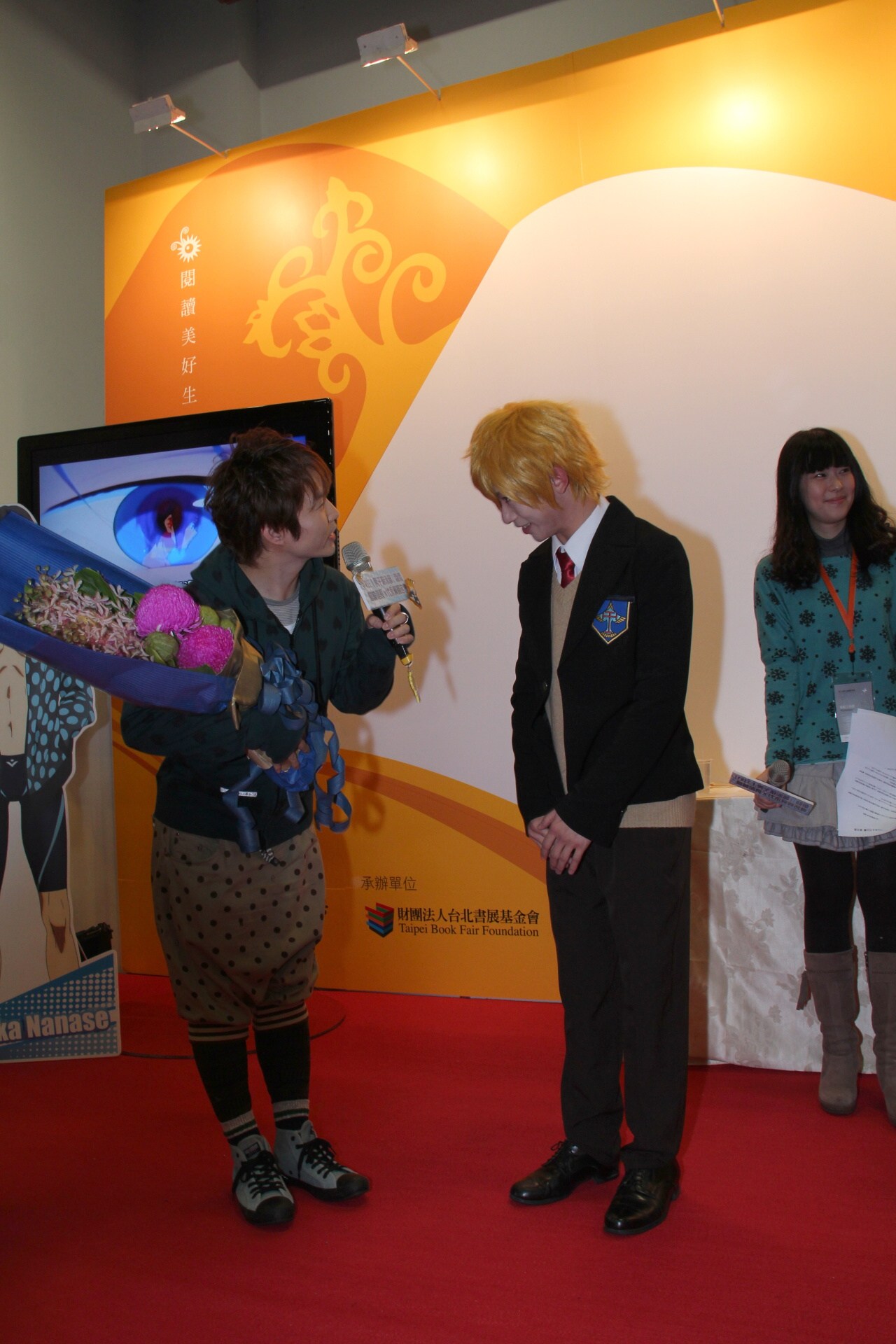 在簡短的自我介紹後,主辦單位請來在稍早活動中扮演兩位角色的 Coser 上台獻花,當問到兩人對台灣的印象時,他們表示平常都會收到很多來自台灣的信件,Twitter 上也有來自台灣的加油,所以之前就很想來台灣了,加上來過台灣的很多前輩也不斷介紹台灣有什麼好吃好玩的,今天能來台灣真的太開心了。現場還有很多人製作了加油的牌子,他們確切的感受到大家滿溢而出的愛。