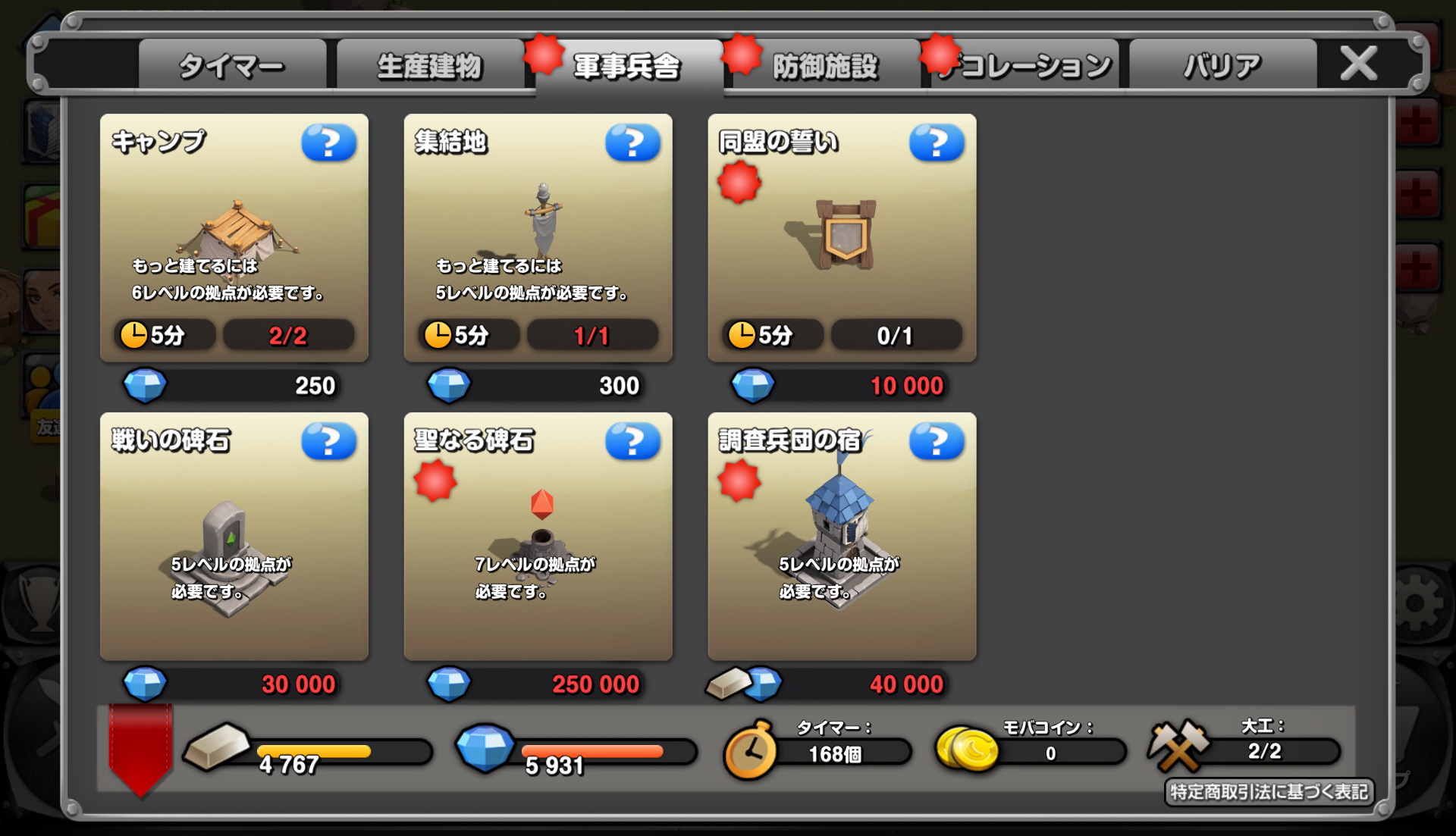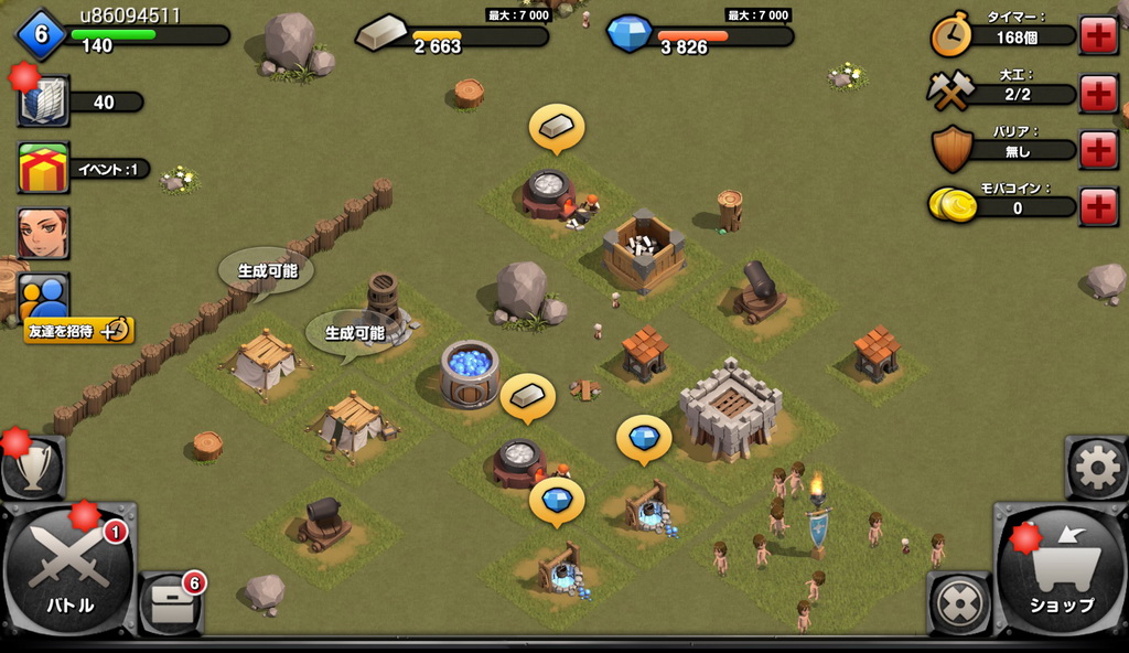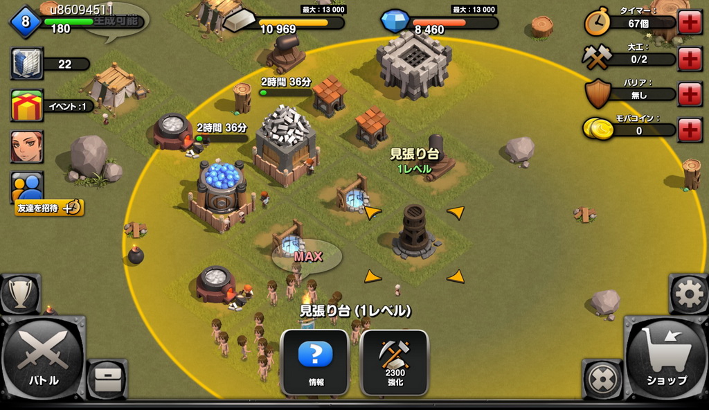 如果想要建造更多設施,就必須將據點的等級提高,不管是新的設施或者是設施數量跟等級上限,都依據點來決定的,所以是一個非常重要的設施。如果想要侵略其他玩家跟進行戰鬥任務的話,玩家就得要先建設營地以及集結地來生產/聚集巨人才可以。