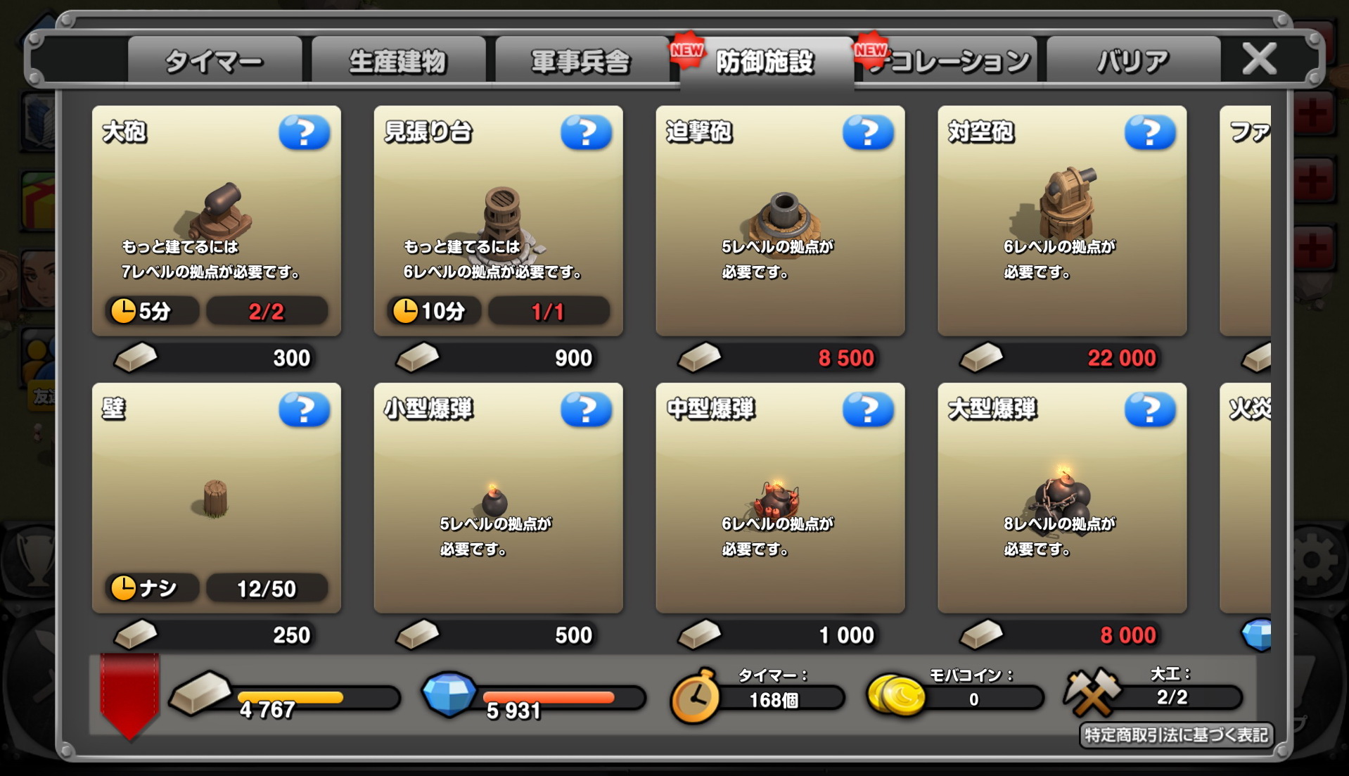 筆者是比較習慣將被打爆也不會噴資源的設施擺在前方引誘巨人攻擊,然後再附近配置炸彈跟砲台等來延長攻擊時間,不過蓋好才發現牆還沒做…另外,在遊戲進行時偶而視窗會跑出巨人接近中,這時只要點擊確定就不會被襲擊了。(離線的話就有機會被襲擊囉)