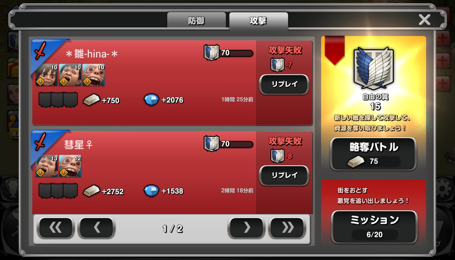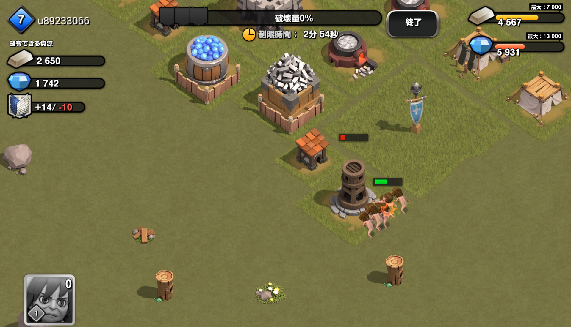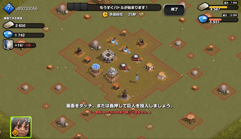 生產好巨人後,就持續的攻擊其他城鎮來奪取資源吧!觸碰想出動的巨人後再觸碰想出發的地點就可讓巨人出現並開始攻擊,一般來說只要破壞掉對方據點或者是破壞量達到 50%時就算是勝利了,不過要特別注意的是,巨人都會有優先攻擊的目標,而且只要出動,不管巨人有沒有生還,都不會在回到玩家城鎮,這點請特別注意。