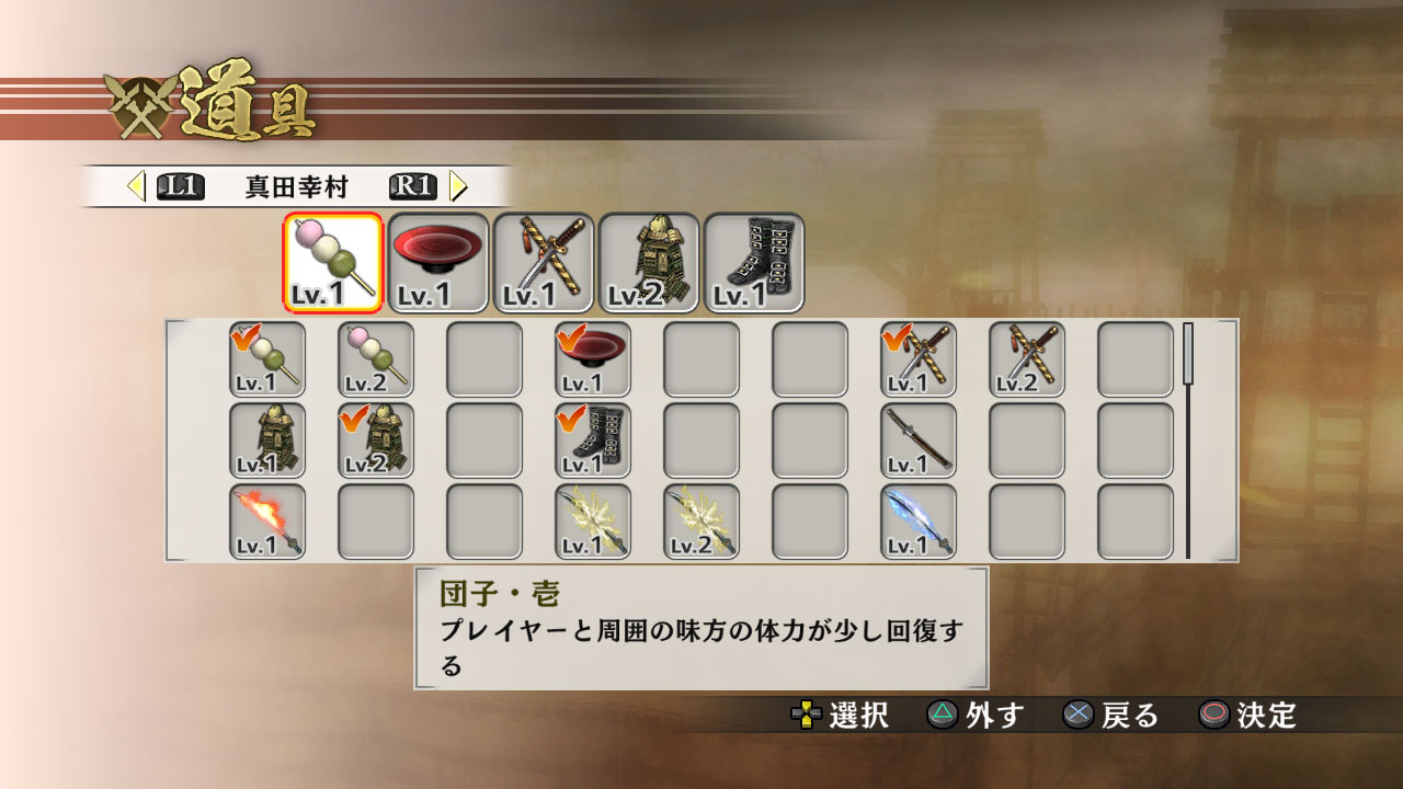 道具 在《戰國無雙 3 》中,可以攜帶道具的系統在本作也將延續。 重視體力,或是重視攻擊等,可以依照戰場的難易度自行選擇要攜帶的道具。