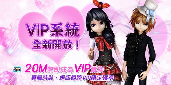 在最新版本中,最受期待的 VIP 系統將趕在情人節來臨之際,與大家見面,全新開放的 VIP 系統將讓玩家感受不一樣的尊貴。VIP 喇叭字體特效,讓玩家與衆不同;成為尊貴 VIP,送玩家專屬 VIP 永久套裝;VIP 升級更有豐富獎勵送給玩家;還有 VIP 專屬房間動作,讓玩家炫出自我,與衆不同。