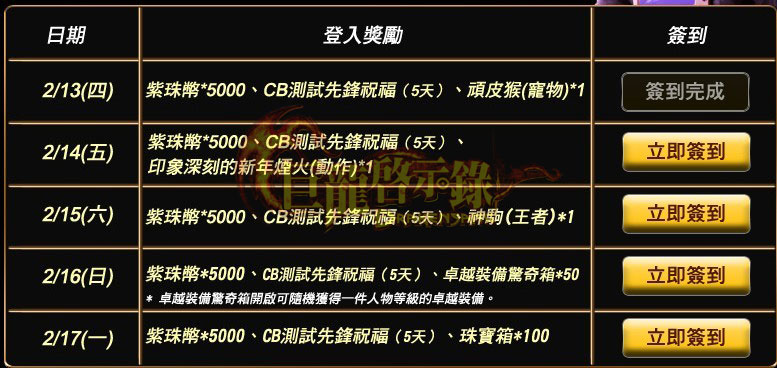 天天玩、天天送,拿完超豐富的封測禮包後,你以為只有這樣嗎?不不不!只要每天上線進行簽到就可以輕鬆拿好禮,每天送你 5000 紫珠幣讓你盡情遊玩,巨龍每日好康真是送到心坎裡!