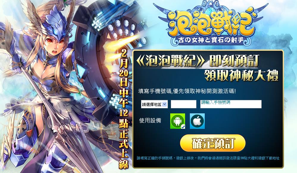 泡泡戰紀》即將於台港澳正式登陸之際,女神未動,禮包先行!只需填寫正確的手機號碼,並選擇所使用的行動設備,按下「確定預訂」按鈕即可於遊戲上線後接受官方透過簡訊所發送的限量神秘大禮及遊戲下載連結;神秘大禮究竟是珍稀女神卡牌,還是進行遊戲所必須的召喚卡牌用「水晶」或是注魂卡牌用的「魂晶」?詳情可留意官方網頁。