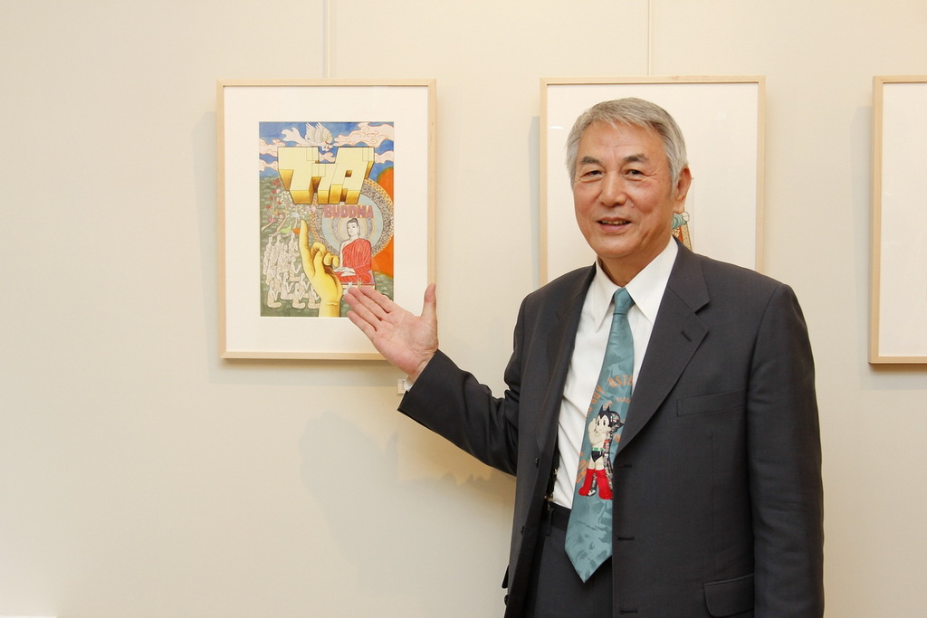 左起)佛陀2導演小村敏明、手塚製作公司社長松谷孝征、監製森下孝三出席手塚畫展開幕儀式
