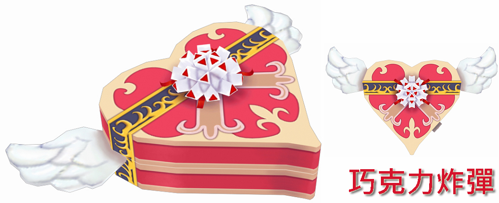 外觀超可愛的巧克力禮盒造型物,其實是擁有超高補血量的「巧克力炸彈」。當玩家和隊友遭到敵隊攻擊時,立即使用,能快速恢復大量HP,拿來送禮也是個好選擇唷!