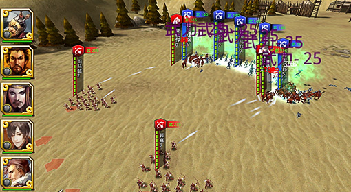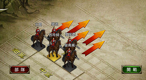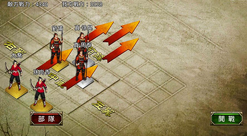 真三國大戰》中,初期玩家的武將陣容通常不是很強大,因此玩家可按照敵方陣型來安排自己的部隊。一開始因為騎兵的科技等級以及使用難度,比較熱門的是三槍二弓、二槍三弓、五騎、五槍的組合。