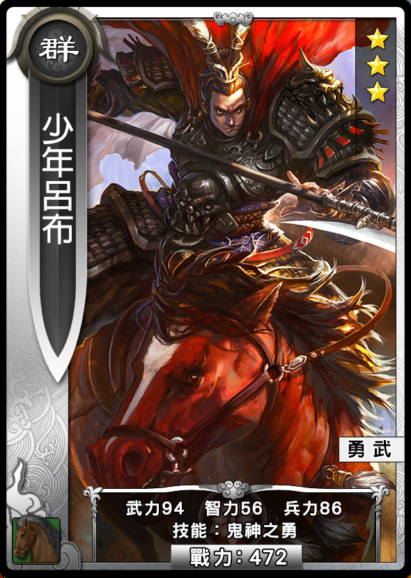 五騎部分推薦的武將部分,以少年呂布為主(尤其是當其升到鬼呂布時非常強勢)、熔火三將的李斌斌(三被動,可以放在隊伍最前面作為尖兵抗傷害)、龐統(被動武力傷害,攻擊很高,單挑奇跡)。