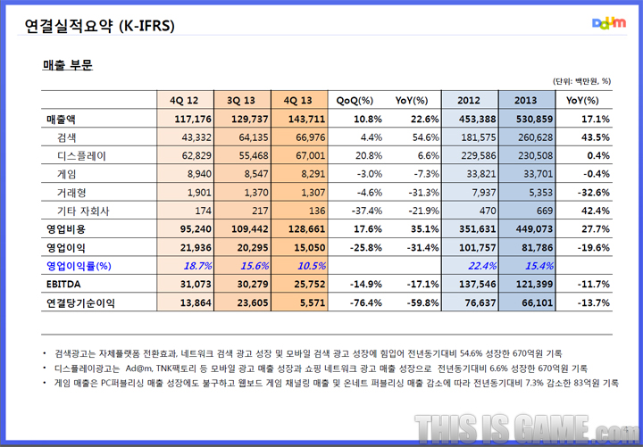 另外也持續觀望手機遊戲市場做出對應,決定集中在線上遊戲市場是因為手機遊戲市場的競爭過度激烈,成功的機會越來越小,2014 年 Daum 的遊戲部門營收可望成長。