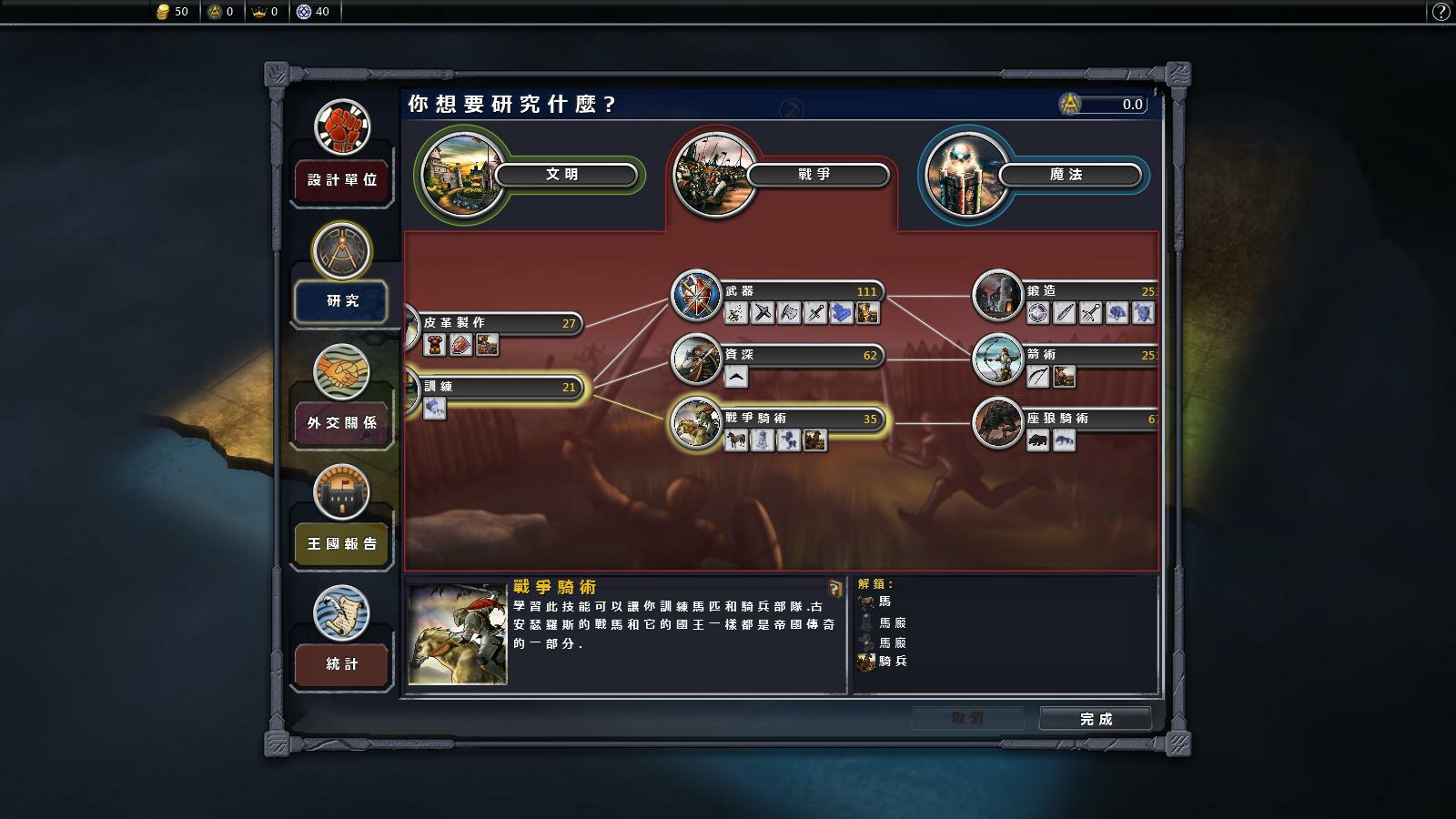 與其他 4X 策略遊戲相同,每個陣營/君王都有不同的先天優勢與或獨家科技,對內政、軍事等層面各有不同的發展適性,因此從最初的陣營抉擇就已經踏入戰略規劃的階段。如果不滿意預設陣營,也有超過 50 種能力選項,可用來新增符合個人喜好的自定義勢力,玩家可從獨家兵種、科研加速、城鎮管理、施法天賦……等多種特殊能力作選擇。