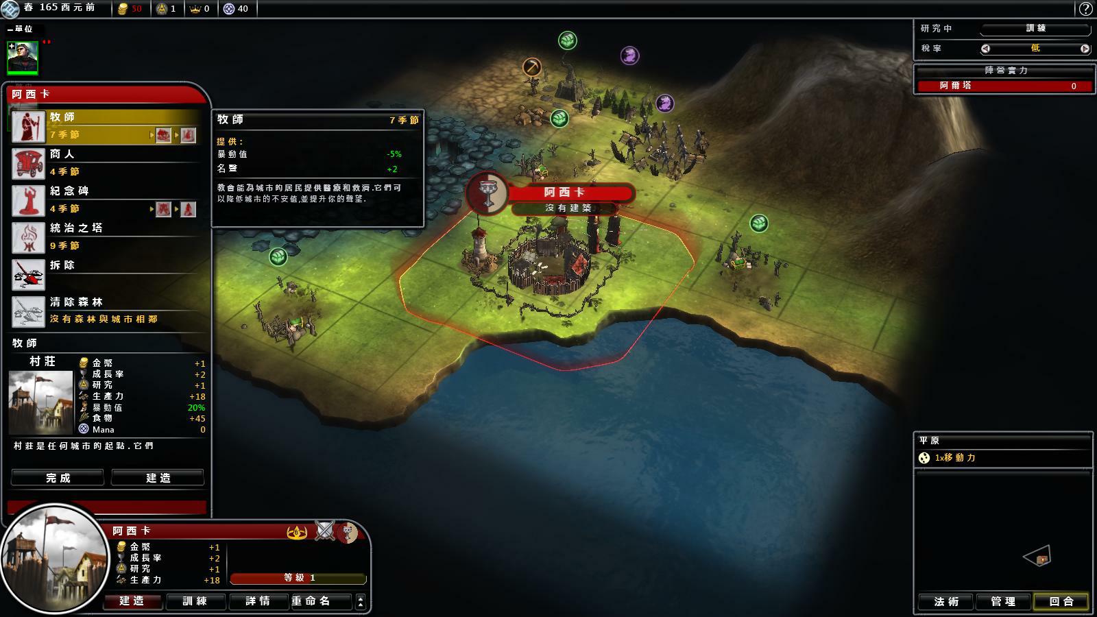 進入新世界並建立主城後,首要為城市規劃碼頭、市政廳、修道院等建築的建設順序,完成新建築才能在金錢、糧食、魔力、科研點數等資源上增加收入,或改善軍隊生產速度與種類。可用的建築則是靠研發科技來解鎖,此外裝備、兵種、魔法……的可用內容也受限於科技,因此科技可視為國家發展的前置作業。而不論科技與建設,一般都需要等待許多回合才能完成。