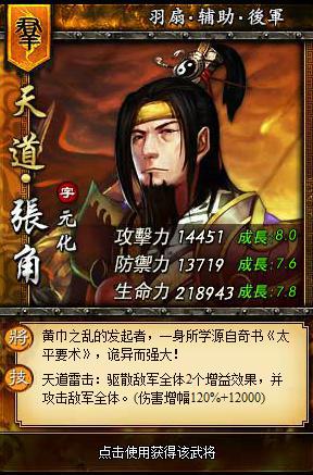 三國亂世,戰火連天,一群以黃巾為標誌的起義軍接過了歷史大旗,在浩瀚歷史中刻下雋永的篇章。這正是歷史有名的「黃巾起義」,而領頭將領就是即日更新的武將「天道·張角」。他天性果敢勇猛,追求公平正義,高呼著「蒼天已死,黃天當立,歲在甲子,天下大吉」的口號,率眾對抗漢王朝。