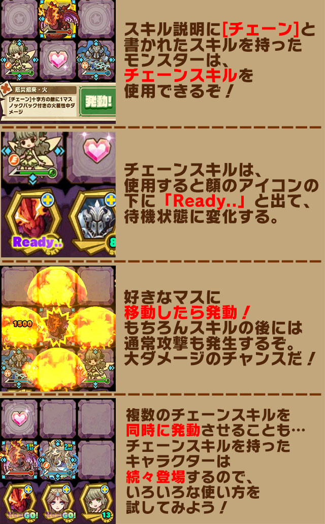 此外隨著「噴災獸」的推出,官方也介紹了新的「連鎖(Chain)」系統。以「噴災獸」為例,牠的主動技能的發動方式與一般的怪獸不同。在玩家啟動主動技之後,「噴災獸」會移動到指定的方格後才發動技能攻擊,同時之後也會啟動一般攻擊。值得注意的是,此技能傷害與普通攻擊將成為 Combo 連段,讓玩家可以在一回合內製造更高的傷害。