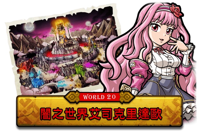 跟隨著月光公主索爾芙,通往黑暗漩渦中的古怪城堡,這裡是世界的中心-闇之世界。第二十世界的開啟,除了給玩家新的劇情體驗外,同時也提供了豐富的獎勵給所有通關成功的玩家們,凡成功攻略第二十世界,即可獲得「世界攻克禮包」,此次禮包將內容加碼為回復藥水 *20、神之轉蛋卷 *1、魔之轉蛋卷 *1、伽利殿下,來回饋所有一直支持《