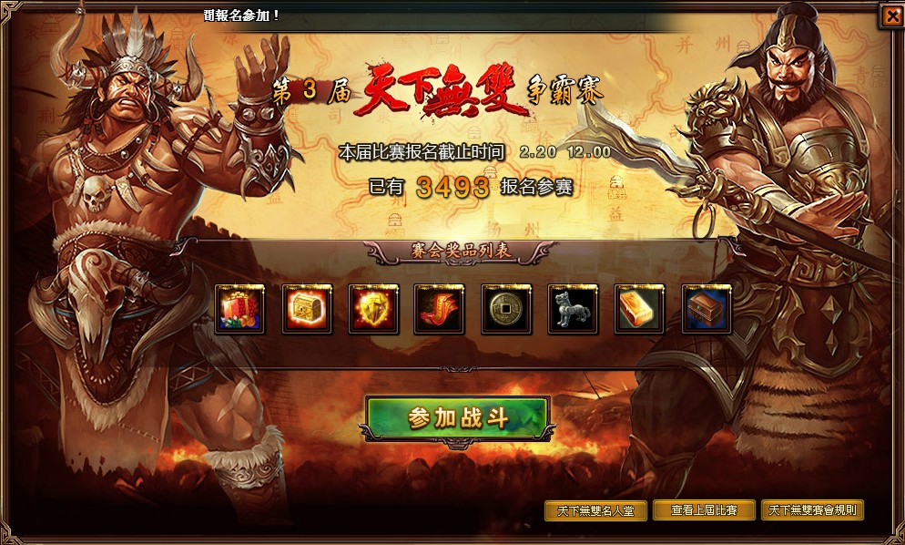 三國亂世,土豪風起雲湧,到底誰才是當之無愧的天下第一?本次改版推出全新跨服鬥將爭霸內容的「天下無雙」爭霸戰,只要等級50級,就可報名參加,挑戰各路豪傑贏取豐厚獎勵不容錯過。