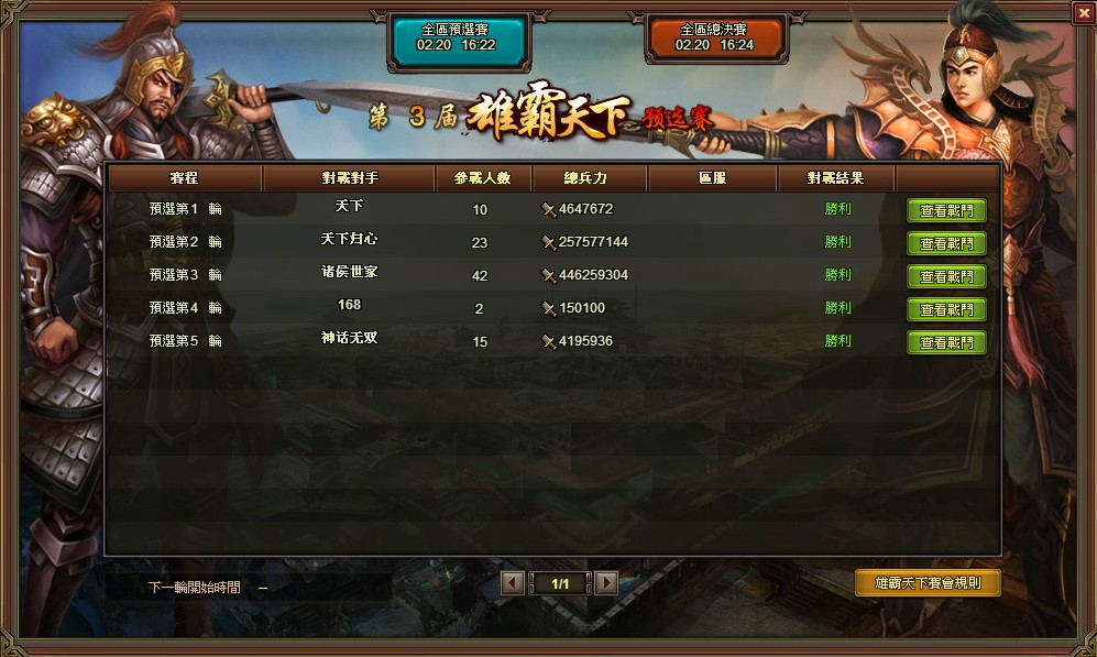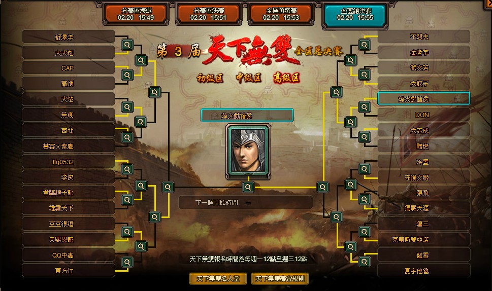 戰鬥模式為五人鬥將戰,類似王圖霸業,比賽分為初級區,中級區、高級區,在分區海選開賽時,根據玩家最後依次保存時的君主等級進入對應等級分區。比賽五大階段為報名期、分賽區海選、分賽區決賽、全區預選賽、全區總決賽,各階段舉辦時間各不相同,務必時時留意最新賽況,