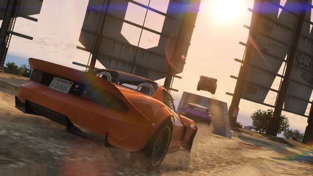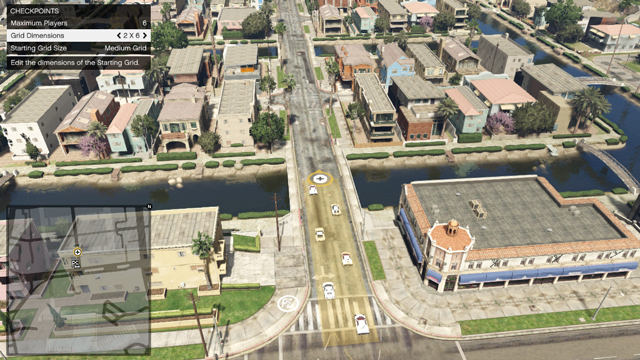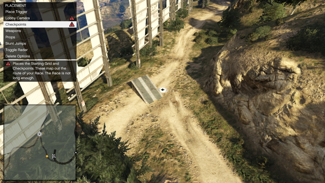 如果選擇創造「GTA 競速」遊戲內容,你可以在你的競速路線上放置「武器」、「醫藥包」和「加速器」。這些全都可以在「佈置器」 > 「武器選單」下找到,而「道具」可以在「佈置器」 > 「道具選單」下找到。巧妙地放置這些東西,可讓你隔開橋樑,建置跳台增添一些好麥塢式的精采鏡頭 - 或是盡情發揮你的想像力。你也可以設置「飛車特技」,如此一來,當車輛爬上特定的斜坡時,攝影鏡頭將會切換至特別的角度。要這樣做,你需要放置兩個標記 - 一個放在斜坡盡頭,也就是玩家起飛的地方,一個用來設置「飛車特技」攝影機的位置。攝影機的高度可按下類比搖桿來做調整。