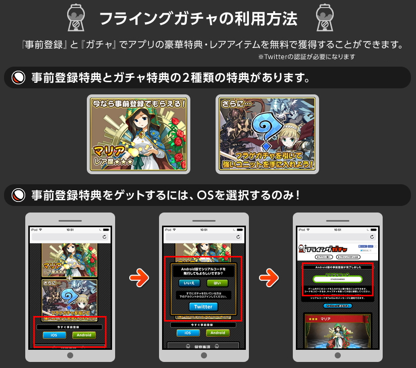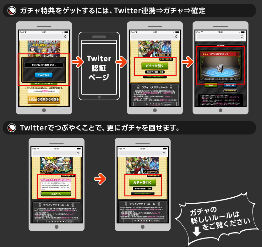 當玩家連續轉了 5 次(一組)轉蛋後,若想再度轉蛋則必須登錄推特帳號發文