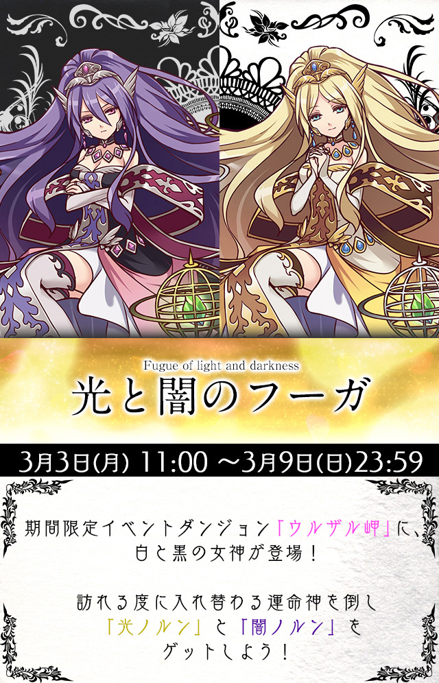 根據官方活動頁面的訊息顯示,本活動將於 3 月 3 日(一)10:00 至 3 月 9 日(日)22:59 舉辦,玩家在關卡中有機率取得 4 星角色「光命運女神(光ノルン)」、「暗命運女神(闇ノルン)」,分別可進化成 5 星角色「聖天女神琉明(聖天女神ルーメン)」及「墮天女神諾克絲(堕天女神ノクス)」。