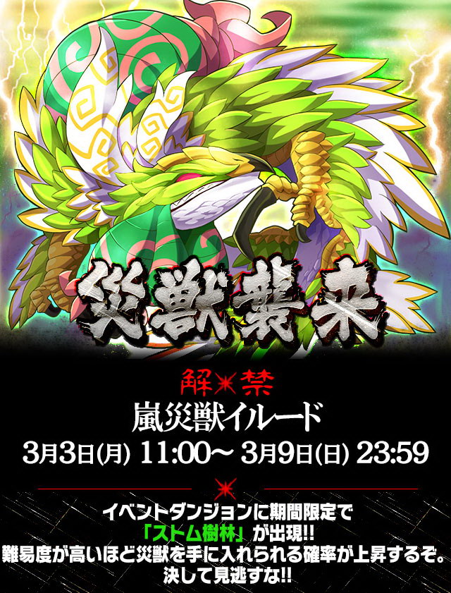 而繼先前推出的「噴災獸」後,於本週的「災獸襲來」限時活動中登場的為木屬性的「嵐災獸」,玩家同樣有機會在 3 月 3 日 10:00 至 3 月 9 日 22:59 開放的關卡中取得這隻全新寵物,關卡難度越高取得機會也越大。另外,根據公告頁面,下週開放的災獸為「波災獸」。