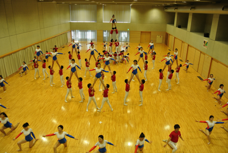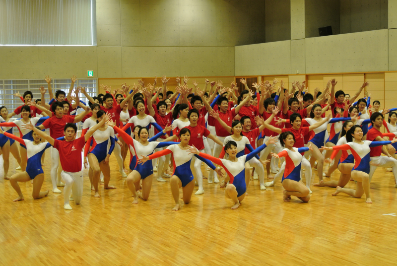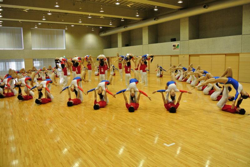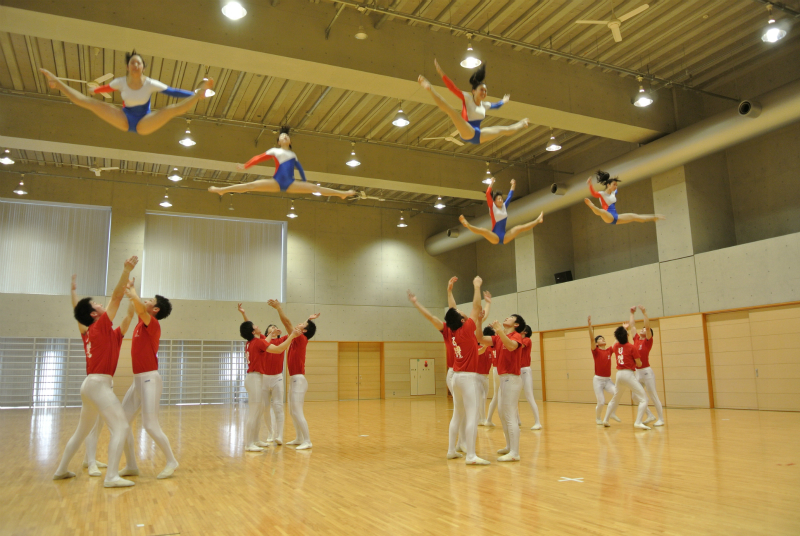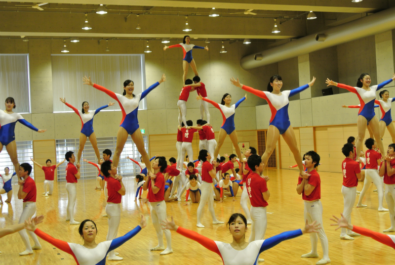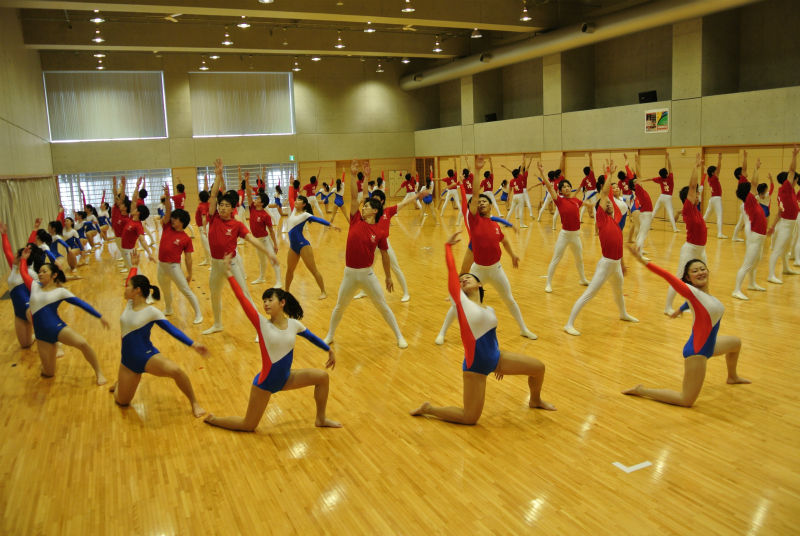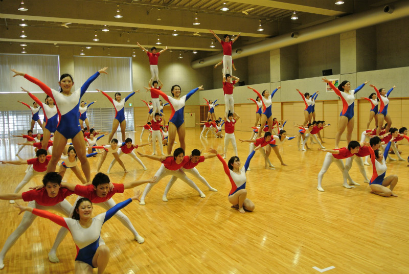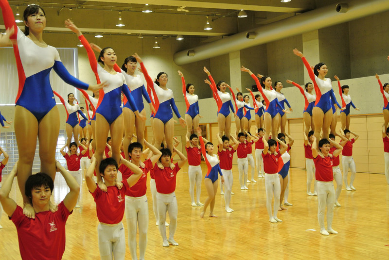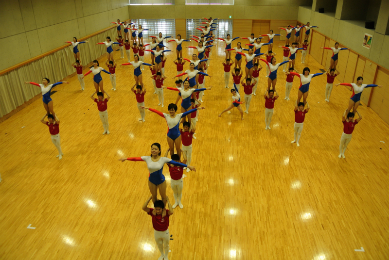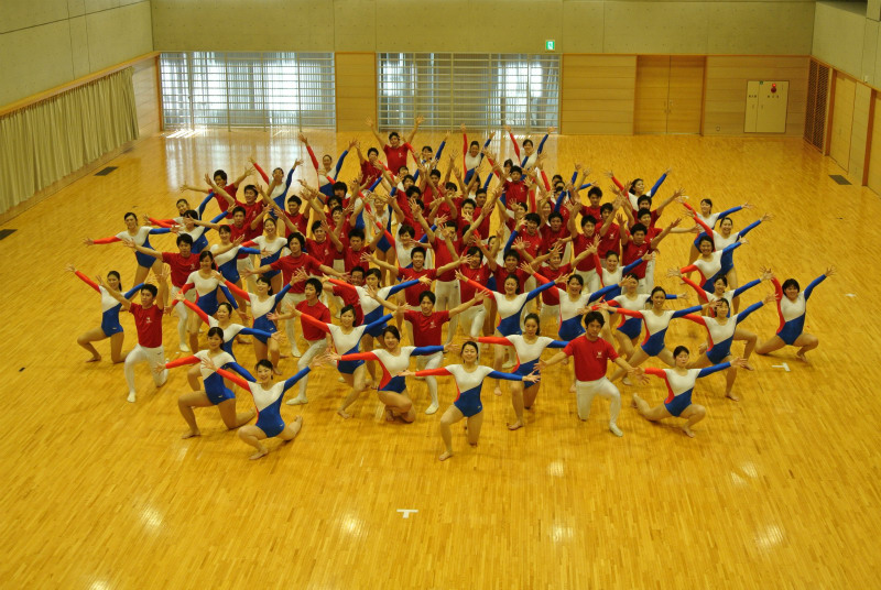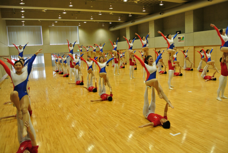 日體大體操部的成員。除了有在日本各地進行集團體操的表演活動之外,2013 年也前往德國跟新加坡表演過