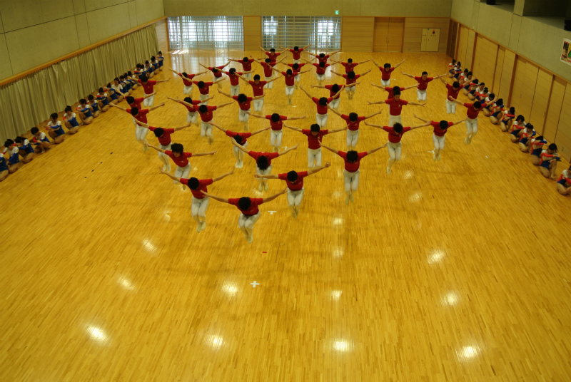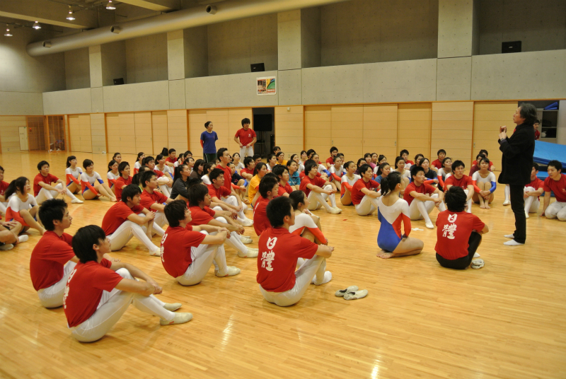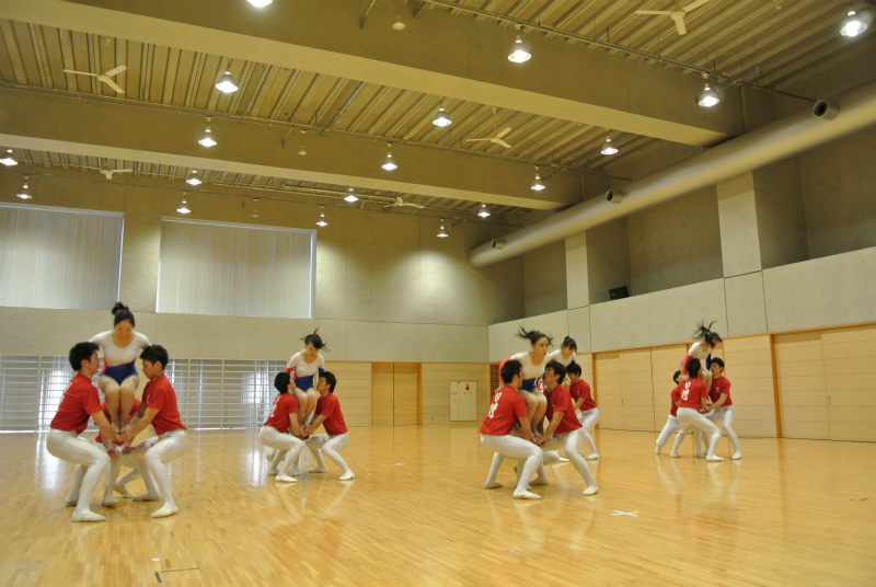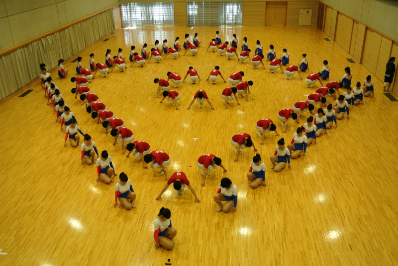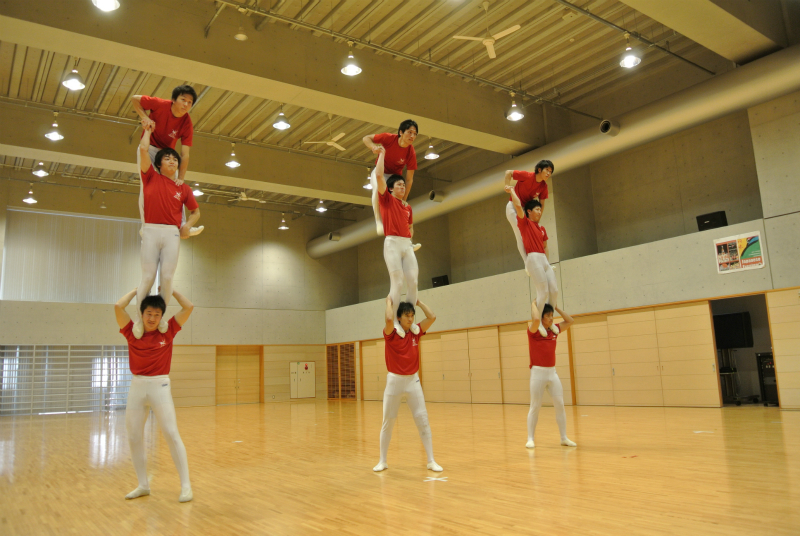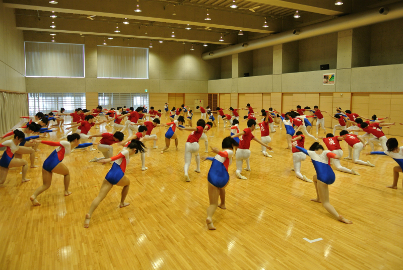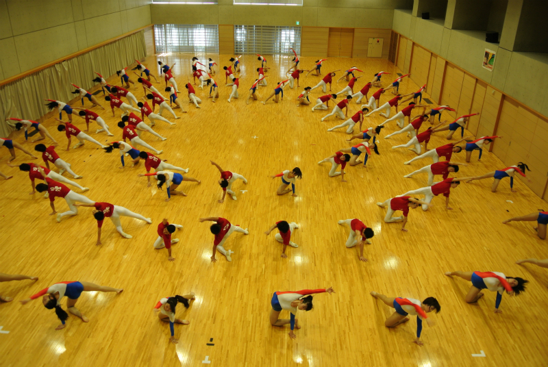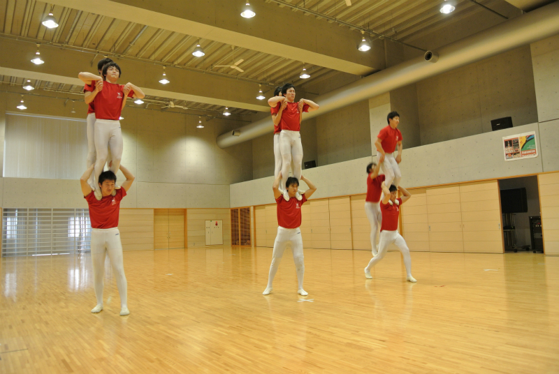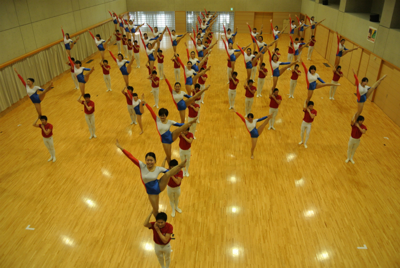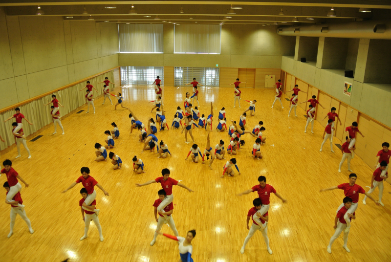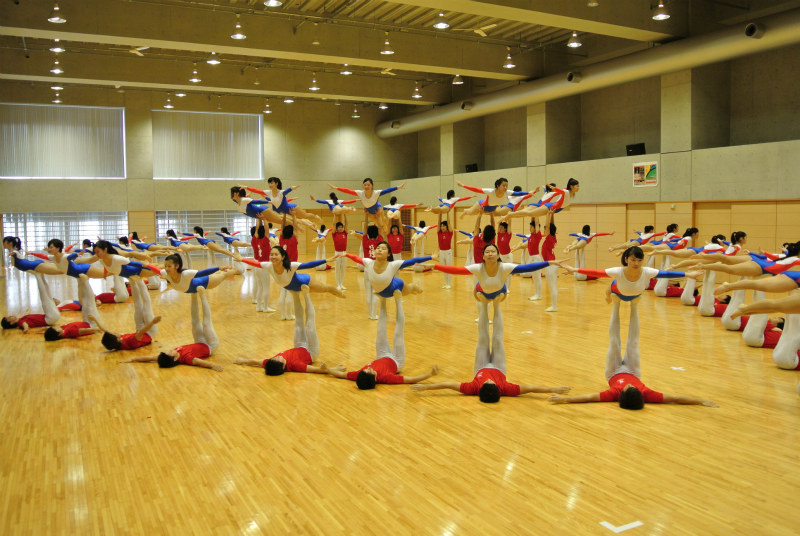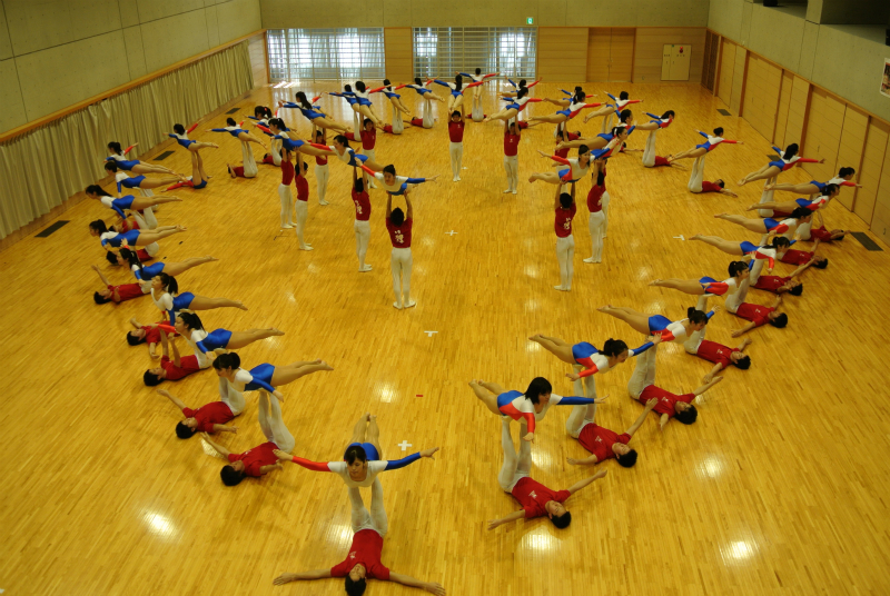 日體大體操部的成員。除了有在日本各地進行集團體操的表演活動之外,2013 年也前往德國跟新加坡表演過