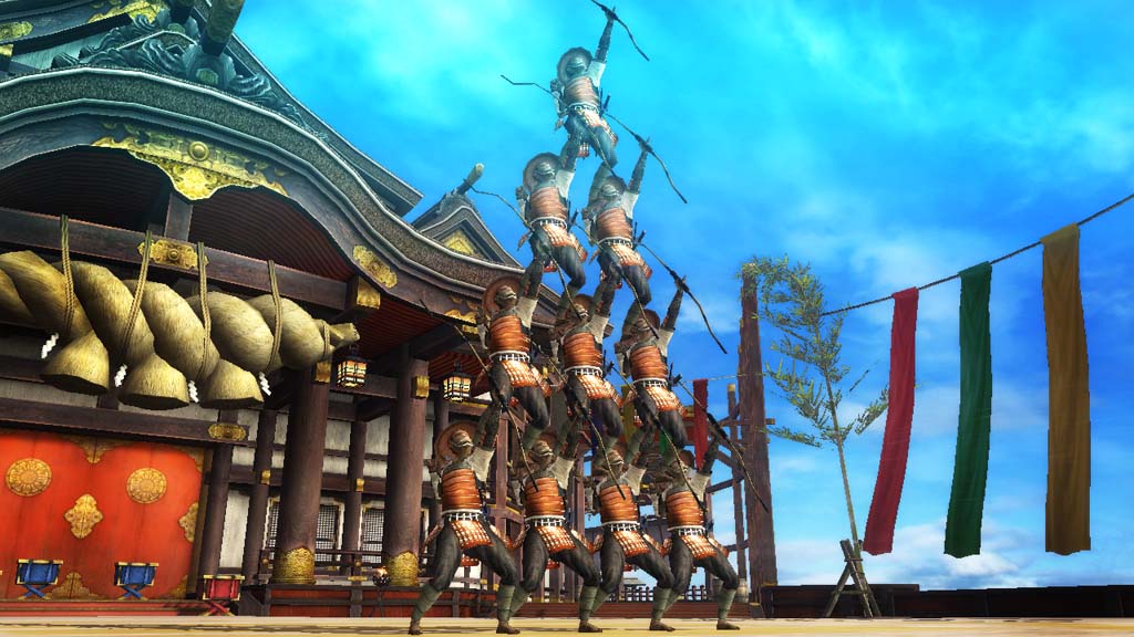 所謂的陣形合體就是敵軍足輕們集合組成陣形進行攻擊的意思。就如上面的遊戲截圖一樣,都是充滿《戰國 BASARA》那種荒唐無稽的動作,實在是無法想像真正的人類可以做到。不過要挑戰這難題的就是日體大體操部的學生們。
