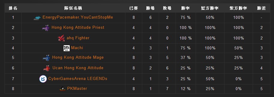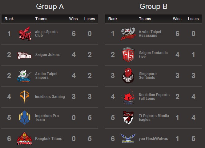 ahq 上周分別對上 Saigon Jokers(SAJ)與 AZB Taipei Snipers(AZB TPS),兩隊對於 ahq 是否能穩居王座相當具有威脅性。雖然 ahq 一開始就因為 ahq Naz 的失誤而讓 SAJ 獲得首殺。所幸 ahq 仍穩住腳步,在成功搶掉小龍之後,更順利將獵人頭數與經濟數拉大,無視於 SAJ 數次強壓中路,仍用自己的節奏取得勝利。而面對 AZB TPS 賽事中,AZB TPS 明顯希望前期能夠拿下優勢,不讓 ahq 後期有翻盤的可能,但 ahq 的操作細節還是優於 AZB TPS 一些,讓 ahq 保持零敗紀錄,蟬聯小組冠軍。