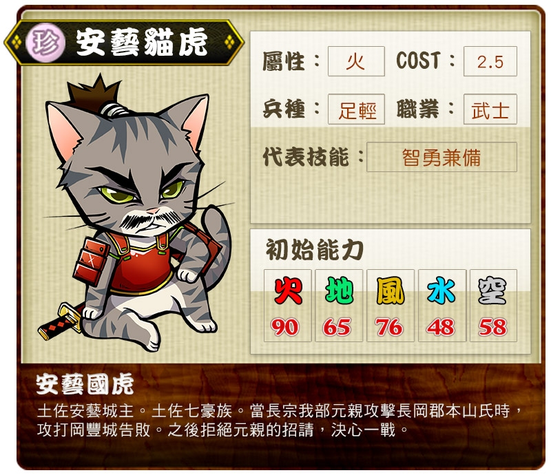 火屬性的「安藝貓虎」為土佐七雄之一,為抵抗長宗我部元親擴張的野心不斷抗戰,最後在彈盡糧絕時向元親投降,以自己的性命來換取家臣及百姓的安全!其代表技能「智勇兼備」可提升攻擊力和策略!