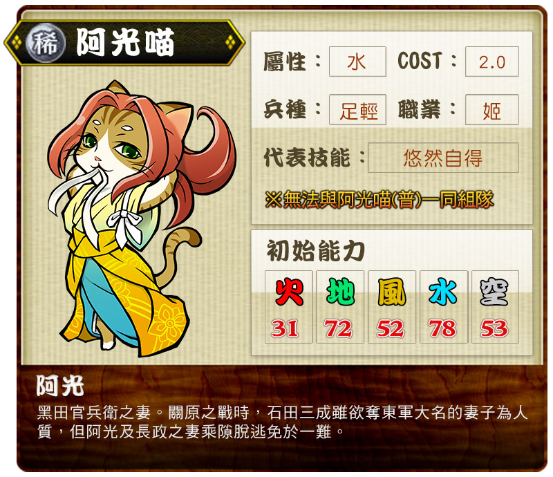 風屬性的「有馬喵氏」為播磨赤松家的庶子,關原之戰中加入東軍參戰,於大阪之陣立功後成為久留米藩領主!遊戲中其代表技「理毛」可解除 1 種周圍我方的屬性弱化!