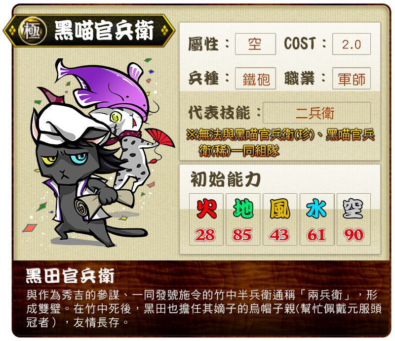 本次改版的唯一極卡「黑喵官兵衛」為豐臣秀吉的參謀,與竹中半兵衛被後世並稱「兩兵衛」!遊戲中其專屬技能「二兵衛」除可對敵人全體攻擊,還能解除敵方屬性強化效果,如與竹喵半兵衛同時在戰場將有隱藏加成效果!