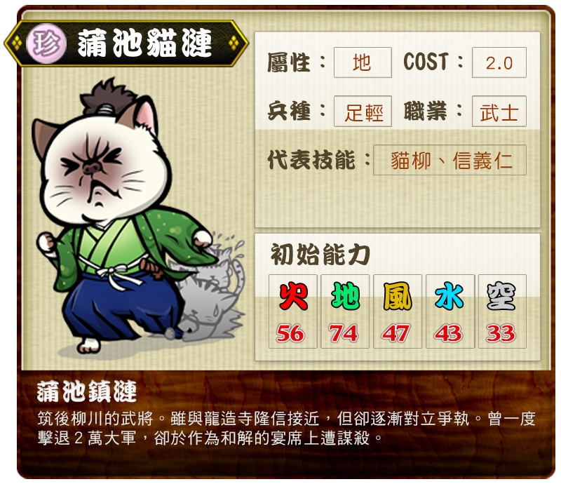 地屬性的「蒲池貓漣」為龍造寺隆信的女婿,卻因隆信的私心導致兩人爭戰,雖然擊退隆信的兩萬大軍,但在次年隨即遭其設宴殺害!其代表技「貓柳」可於一定時間內吸引複數敵人的注意!
