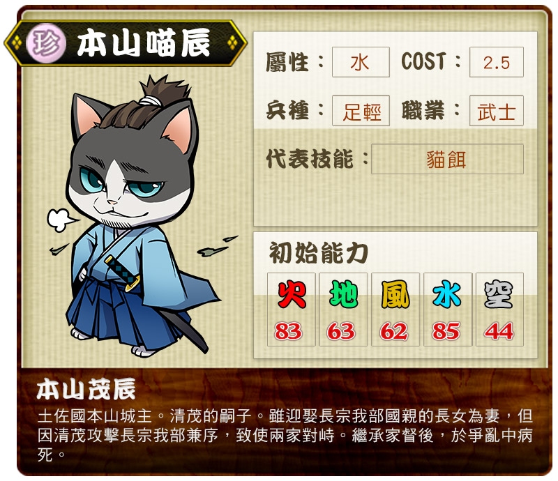 水屬性的「本山喵辰」為土佐國的本山城主,本山茂宗的長子,與長宗我部國親長期對抗,後不幸 病死!遊戲中其代表技能「貓餌」可以回復自身的兵力!