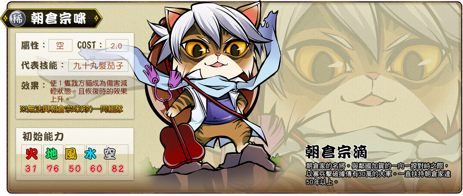 朝倉宗咪為朝倉家的名將,又名「左衛門尉教景」,曾僅以一萬兵力擊退一向宗的三十萬大軍,生平更只有打過一次敗仗!遊戲中專屬技能「九十九髮茄子」可減輕我方一隻貓武將傷害,並同時提升恢復效果!