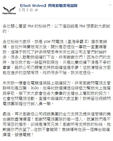 TeSL 第三季升降賽決賽中失利的《星海爭霸 2》選手 Hui,在經過幾日的思考後,正式宣布退役。他表示,因為大家的支持、信任他才可以一路堅持到現在,只是比賽成績下滑是不爭的事實,雖然公司仍願意支持他繼續追選手夢,但他清楚個方面能在進步的空間有限,縱然有很多不捨,他決定退役。