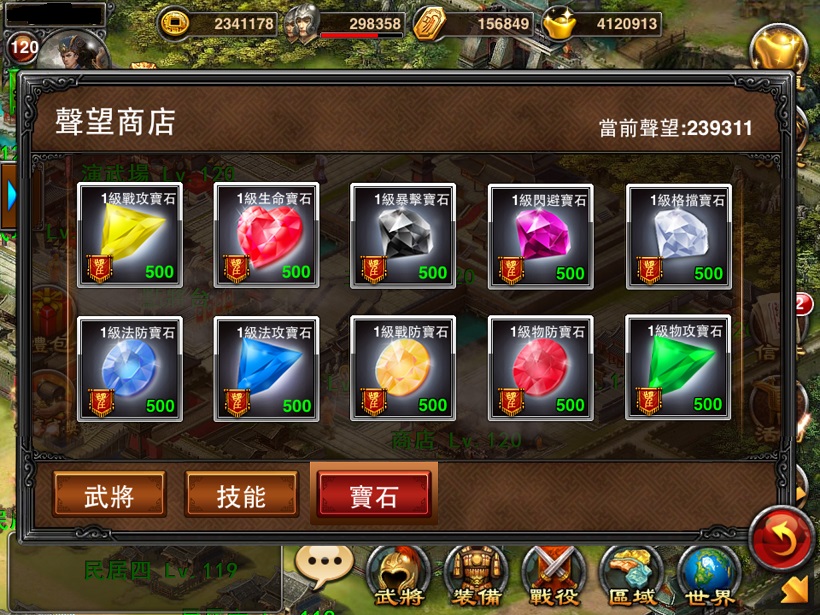 在遊戲中,視玩家武將官職等級的高低,可以額外獲得徵收、攻擊和防禦值加成的效果,然而想要升級官職則必須消耗「聲望」;本次改版全新登場的「聲望商店」,不論是武將、技能、寶石應有盡有,玩家們可以消耗聲望以取得聲望武將 (每日限購 1 個)、初級技能書、1 級寶石 (每日限購 10 個),讓玩家的三國戰隊快速升級。