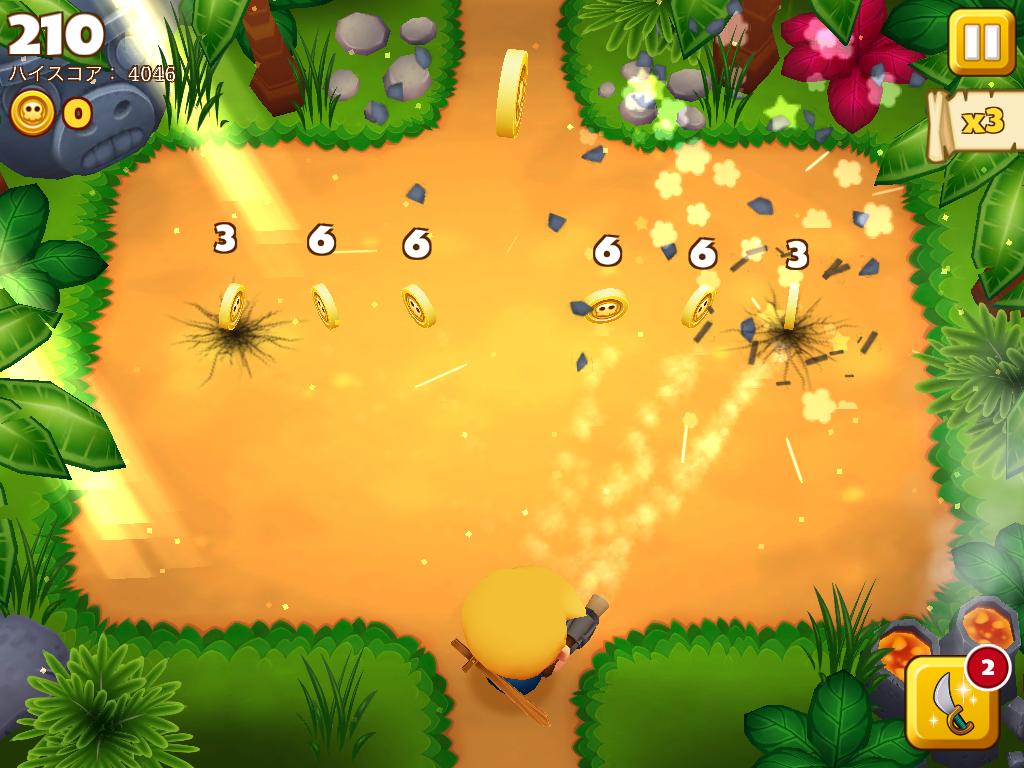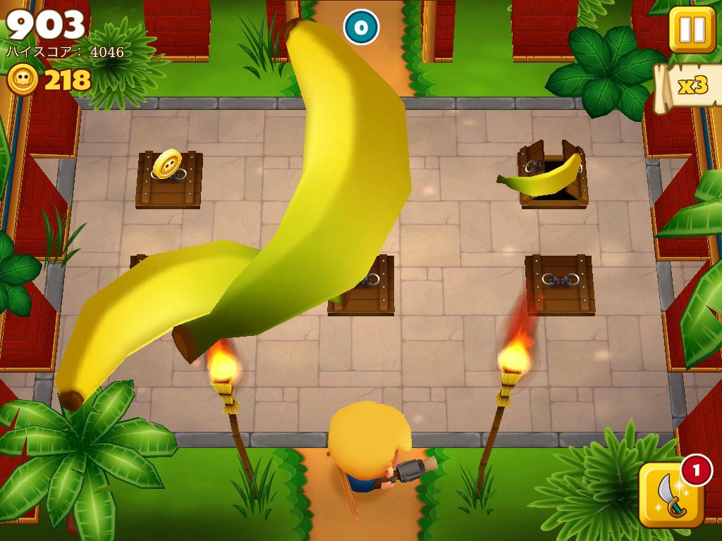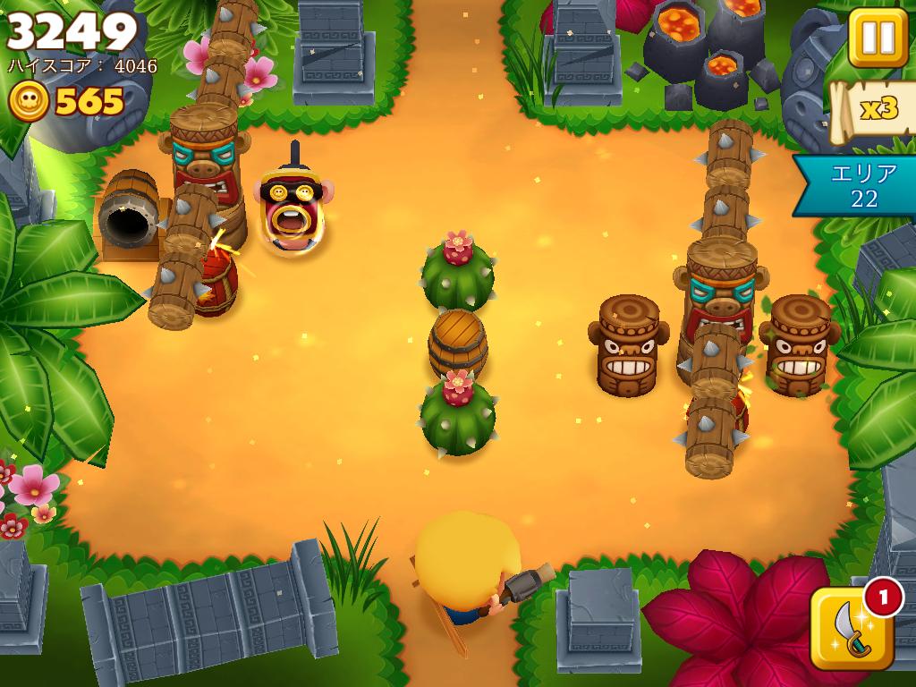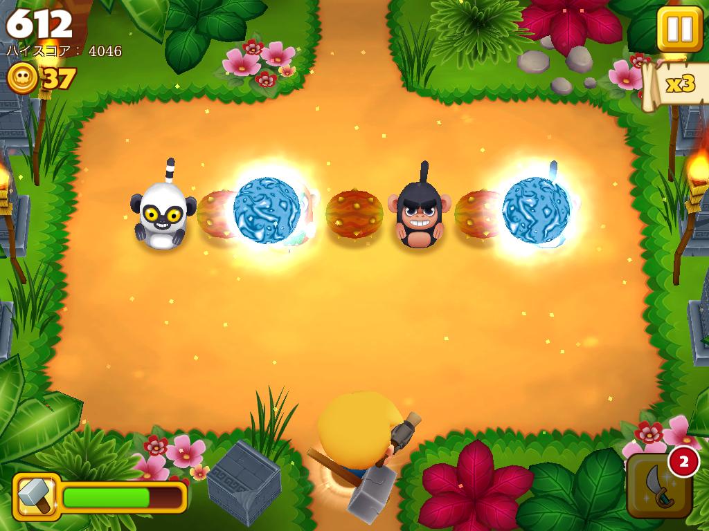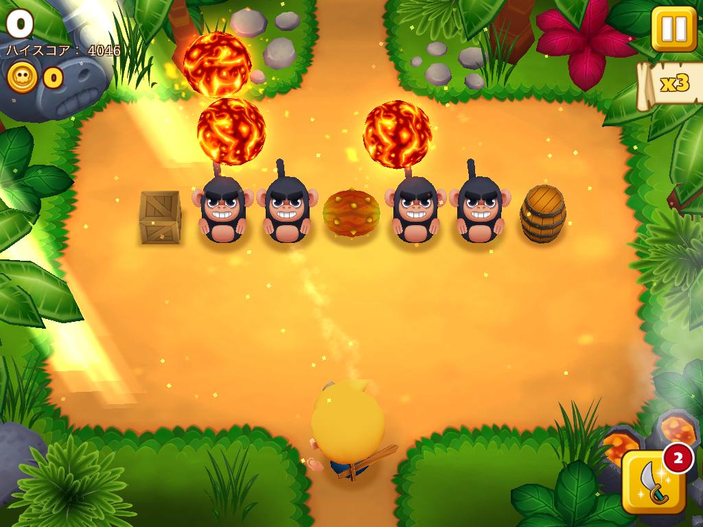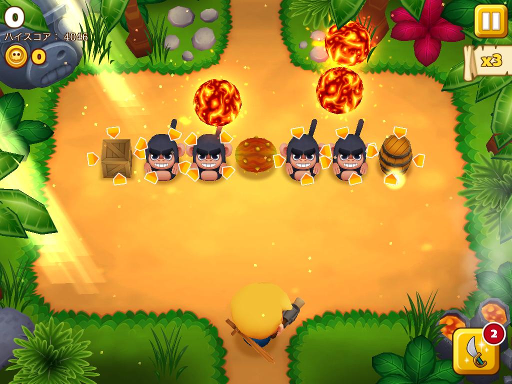 不過想獲得高分的話光是用點擊可是行不通的,如果玩家們用滑動的方式一口氣將所有猴子鎖定起來一起解決,就能獲得額外獎勵分數。不過要注意的是,遊戲中也有許多的陷阱,像是火球、火圖騰等等,碰到這些東西就馬上 GAME OVER 了。