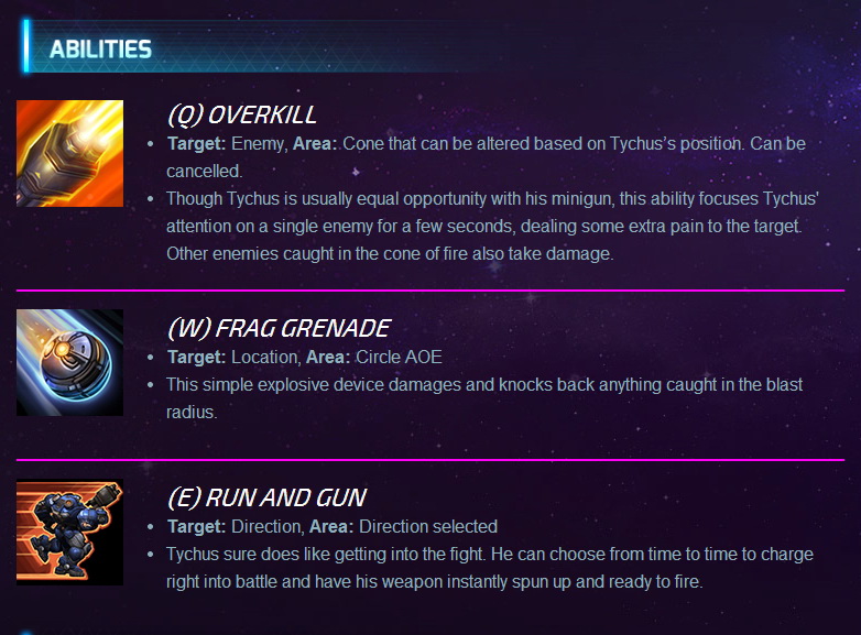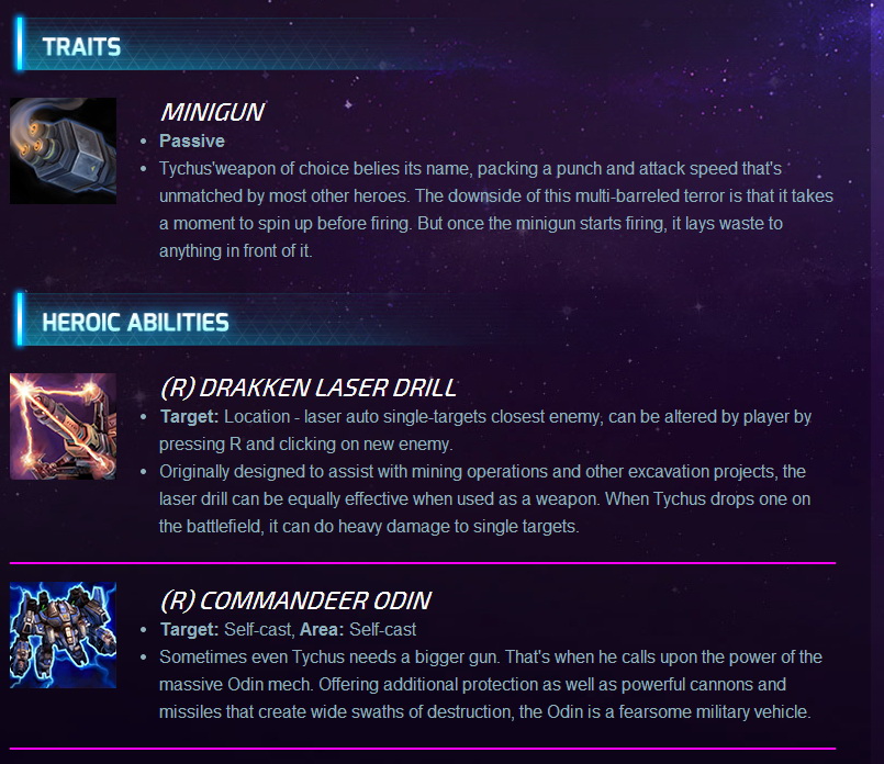 新英雄「泰科斯」屬於一名遠程角色,可施放「OVERKILL」、「FRAG GRENADE」針對單體或某特地範圍內的敵人進行攻擊。此外,在戰場中「泰科斯」還可以選擇招喚「RAKKEN LASER DRILL」對單一目標進行嚴重的破壞,或是駕馭奧丁(COMMANDEER ODIN),以額外提升自身的保護並提高攻擊強度。更多關於「泰科斯」戰場技巧、造型、相關創作等將陸續釋出。