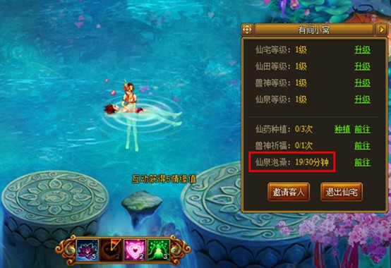 玩家每天可在仙泉中沐浴 30 分鐘,活動期間可持續獲得經驗值(角色等級、仙泉等級越高,獲得經驗越多),還可通過與愛侶進行按摩、搓背、互擁等互動獲得情緣值獎勵。