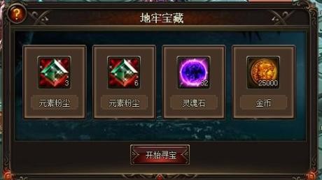 地牢寶藏可以隨機獲得靈魂石、金幣和獨家道具『元素粉塵』其中一種獎勵。BUFF 則有幾種,分別是減少 30% 戰鬥CD,減少 30% 移動 CD,減少 30% 觸發事件 CD 和增加 10% 攻擊的 BUFF。合理的利用這些 BUFF 可以使得通關所用時間大大減少。團隊中只要有任何一人達到終點,打贏 BOSS 全隊即可通關。最後,根據通關所用的總時間,可以獲得不同的評價。通關時間越少,評價越高,獲得的獎勵也越好。