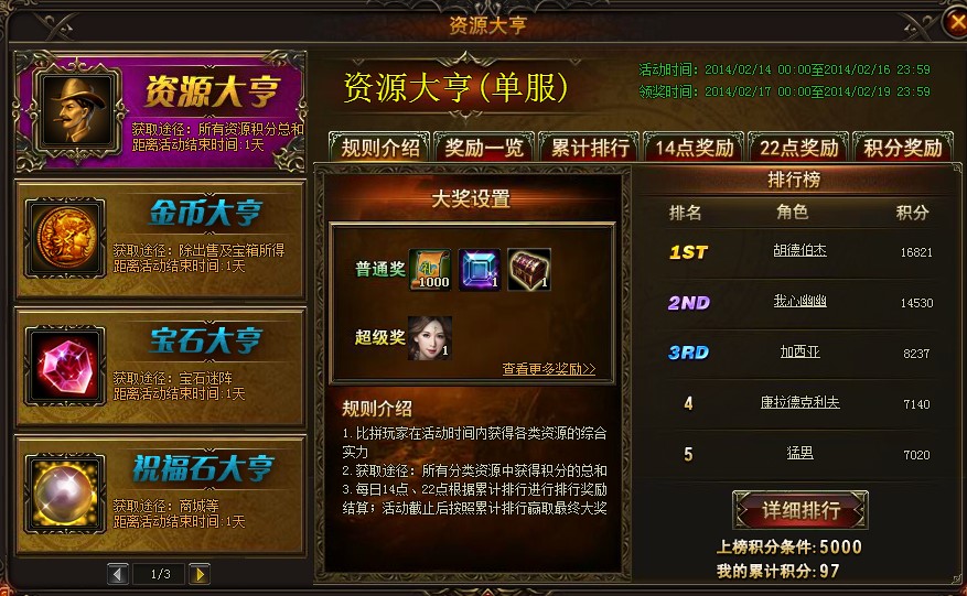 1.比拼玩家在活動時間內獲得各類資源的綜合實力;