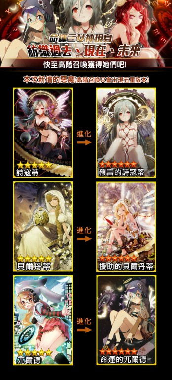 北歐神話中著名的命運三女神,預見未來的「詩寇蒂」、關注當下的「貝爾丹蒂」、檢視過去的「兀爾德」也化身為卡牌登場,這三姊妹不但掌握了人類的命運,甚至也能預告諸神、巨人以及侏儒們的命運。即日起至 3 月 27 日止,活動期間內高階召喚命運三女神出現的機率上升 3 倍!